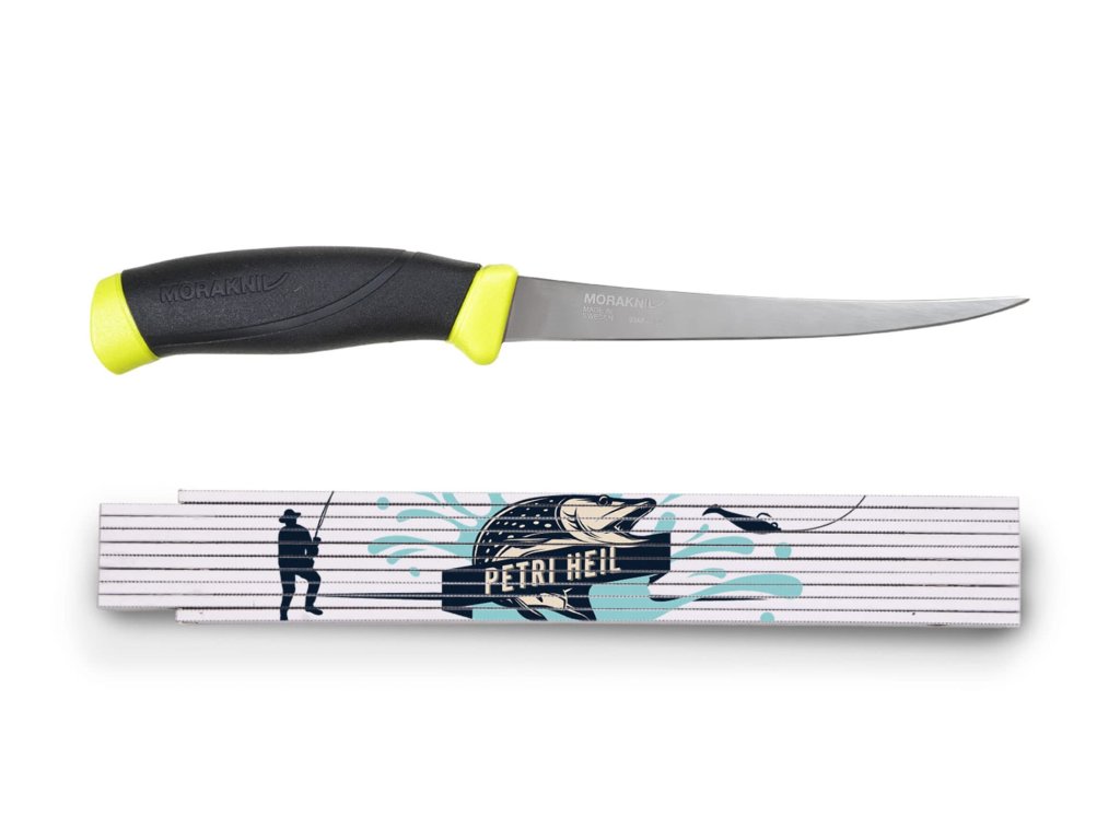 Unser Set für Angler und Outdoor-Enthusiasten beinhaltet einen 2m-Zollstock, bedruckt mit 30 Fischarten, und das vielseitige Fillet 155 Messer von Morakniv – ein Muss für jede Angeltour.