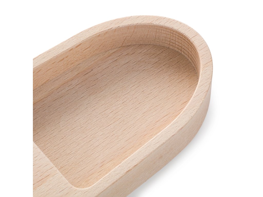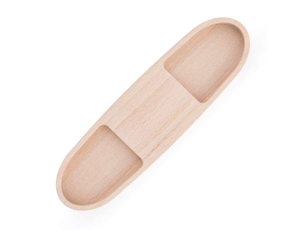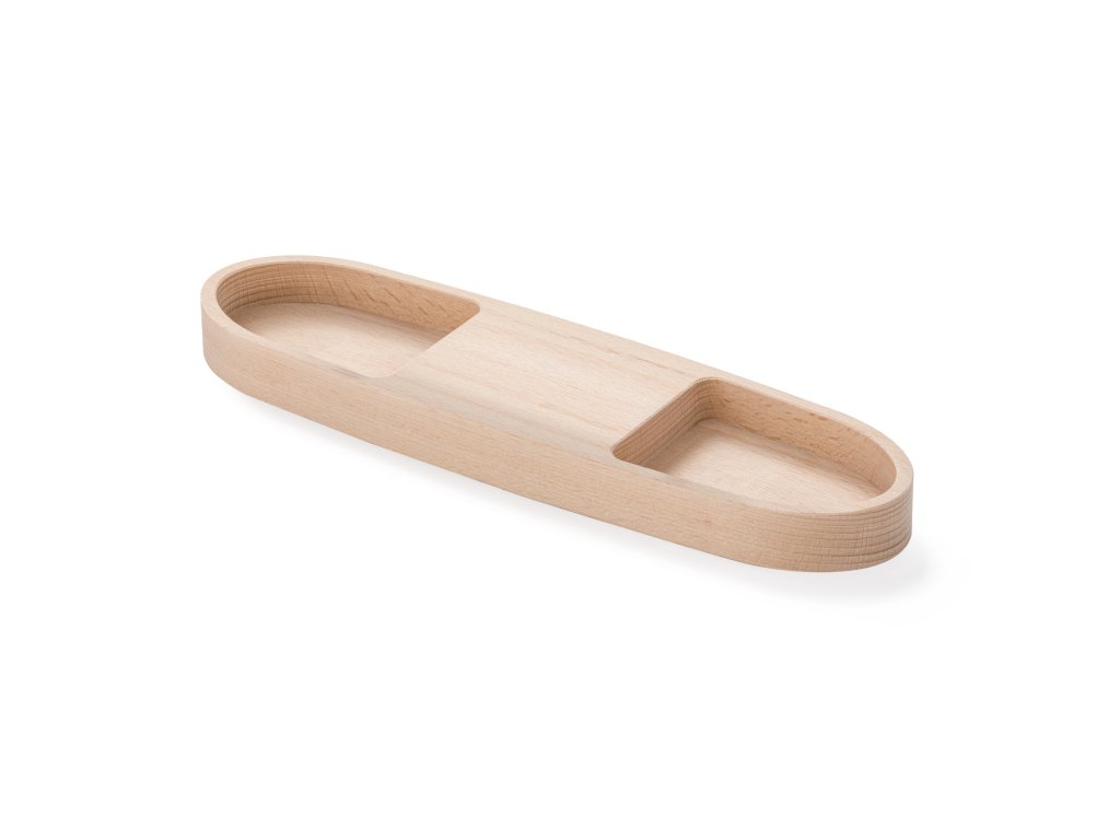 Die Schale besteht aus 20 mm starkem Buchenholz. Zwei abgerundete Fächer sind in den Korpus eingelassen und durch eine flache Trennwand getrennt, die zugleich eine betonte Ablagefläche bildet.