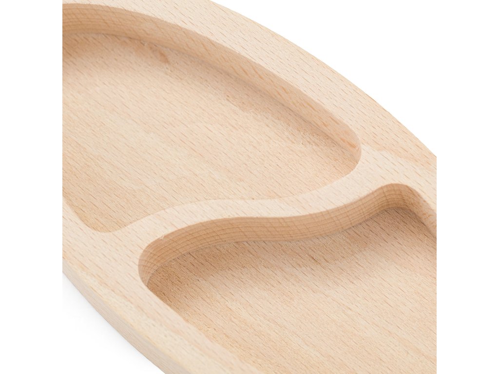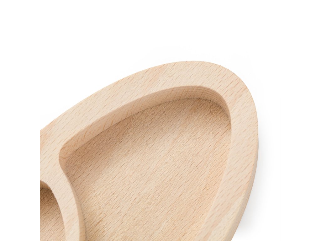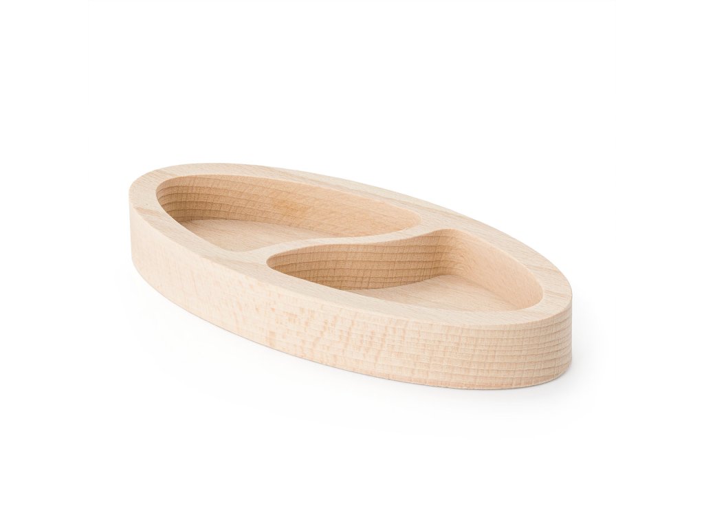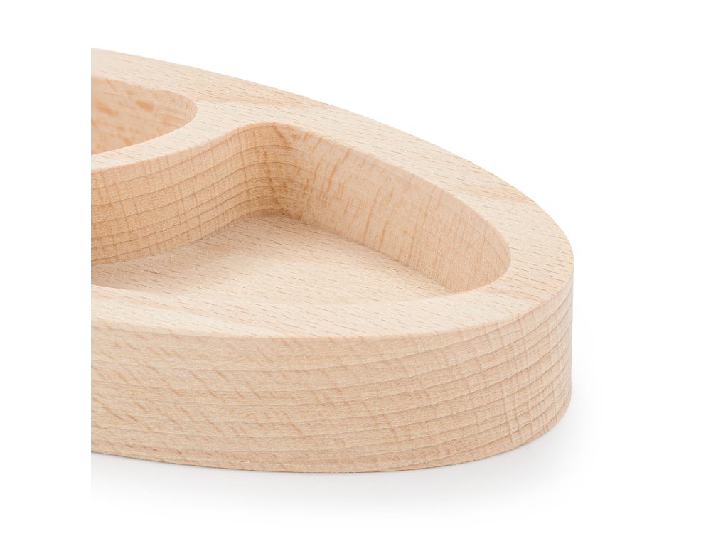 Gefertigt aus massivem Buchenholz ohne Oberflächenbehandlung. Das helle Holz mit einer Stärke von 20 mm besitzt eine feine Maserung, die das Erscheinungsbild natürlich abrundet. Die Fächer sind direkt in den Korpus der Schale eingelassen.