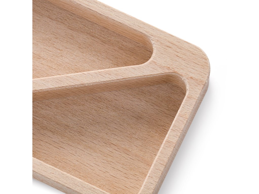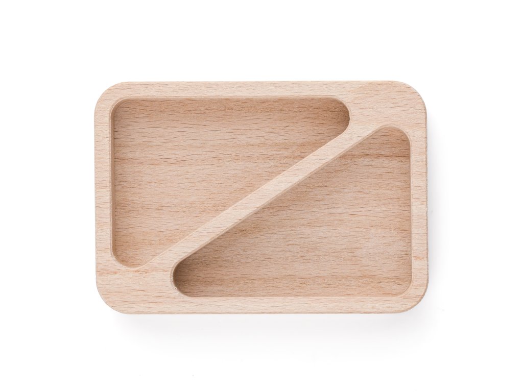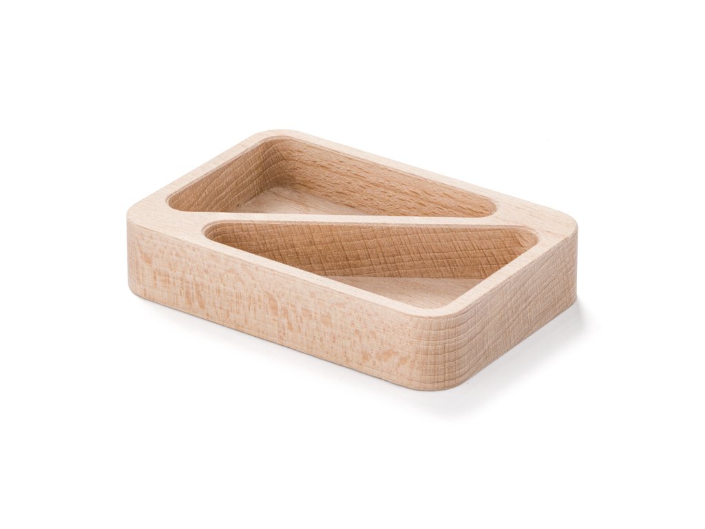Das gesamte Produkt besteht aus einem Block Buchenholz mit einer Stärke von 20 mm. Die Trennwand ist präzise eingefräst, ohne zusätzliche Verbindungen, wodurch die Materialeinheit erhalten bleibt. Die glatt bearbeitete Oberfläche hebt die natürliche Maserung des Holzes hervor und fühlt sich angenehm an.