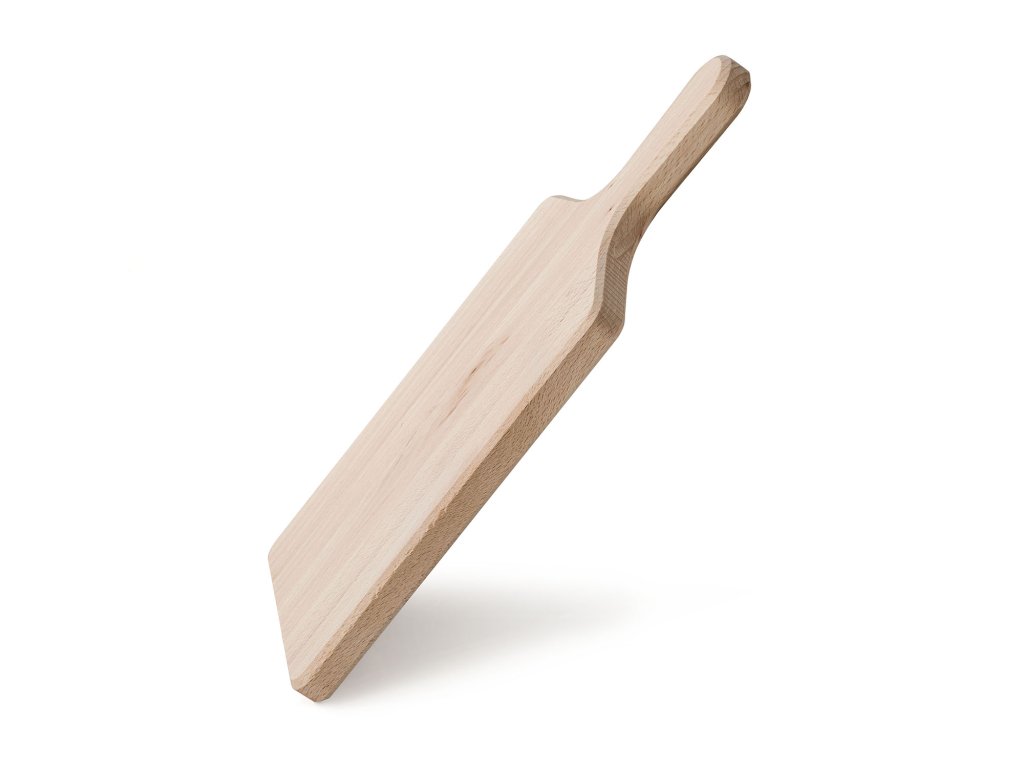 Das rechteckige Schneidebrett mit Griff eignet sich für die übliche Zubereitung von Zutaten in der Küche. Dank des verlängerten Griffs liegt es gut in der Hand und wird häufig auch zum direkten Servieren von Speisen oder Gebäck verwendet.